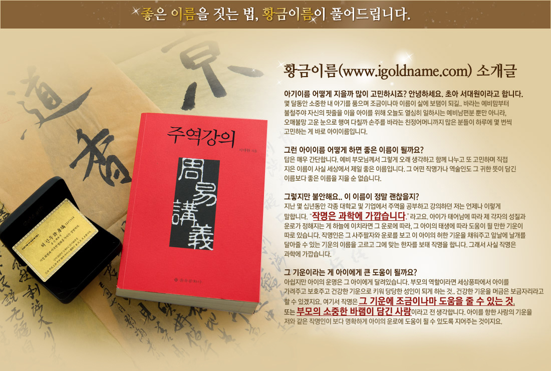 | 14 | 인터넷 작명소 황금이름 탯줄도장 서비스 개시 | 2020/05/20 | 578 |